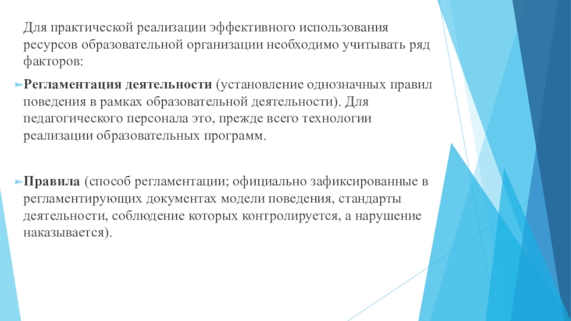 Слайд 15Для практической реализации эффективного использования ресурсов образовательной организации необходимо учитывать ряд