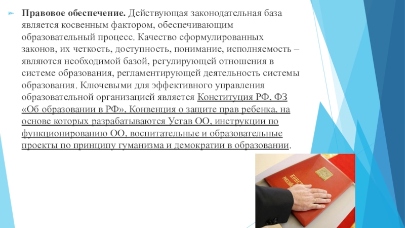 Качество сформулированных законов, их четкость, доступность, понимание, исполняемость – являются необходимой базой, регулирующей отношения в системе образования, регламентирующей деятельность системы образования. Ключевыми для эффективного управления образовательной организацией является Конституция РФ, ФЗ «Об образовании в РФ», Конвенция о защите прав ребенка, на основе которых разрабатываются Устав ОО, инструкции по функционированию ОО, воспитательные и образовательные проекты по принципу гуманизма и демократии в образовании.