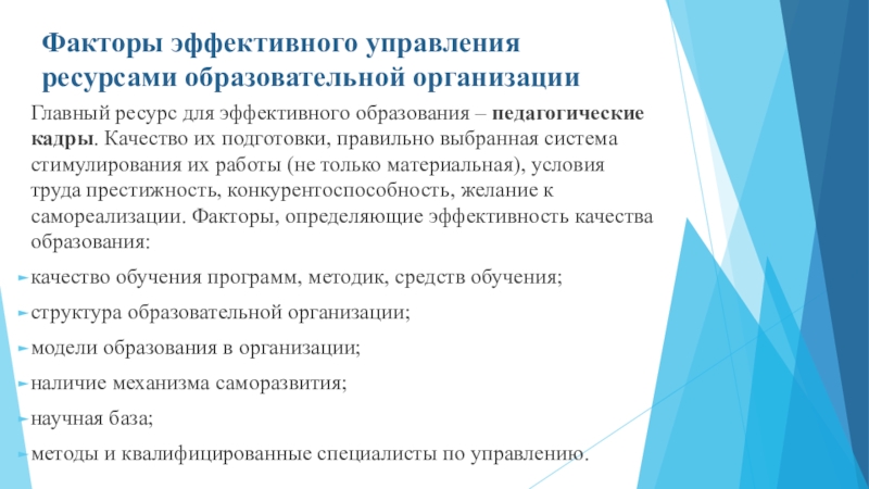 Слайд 14Факторы эффективного управления ресурсами образовательной организации