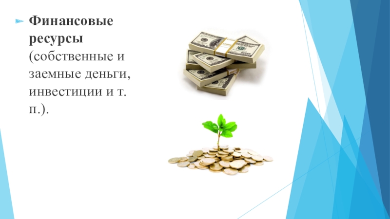 Слайд 4Финансовые ресурсы (собственные и заемные деньги, инвестиции и т.п.).