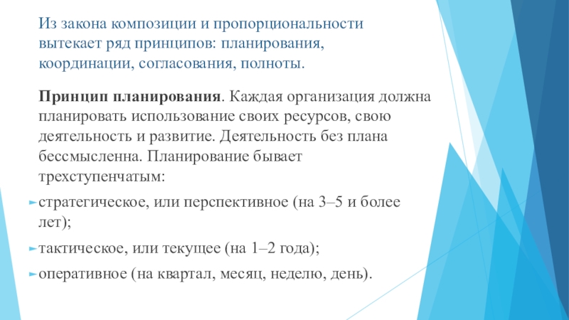 Из закона композиции и пропорциональности вытекает ряд принципов: планирования, координации, согласования, полноты.