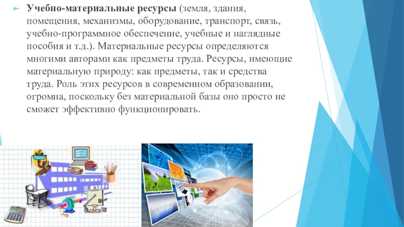 Слайд 3Учебно-материальные ресурсы (земля, здания, помещения, механизмы, оборудование, транспорт, связь, учебно-программное обеспечение,