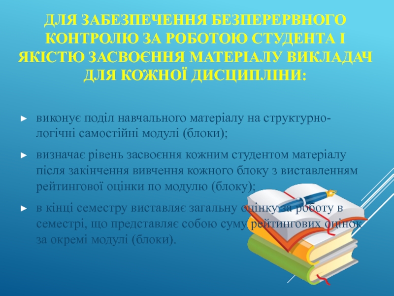 Слайд 7ДЛЯ ЗАБЕЗПЕЧЕННЯ БЕЗПЕРЕРВНОГО КОНТРОЛЮ ЗА РОБОТОЮ СТУДЕНТА І ЯКІСТЮ ЗАСВОЄННЯ МАТЕРІАЛУ