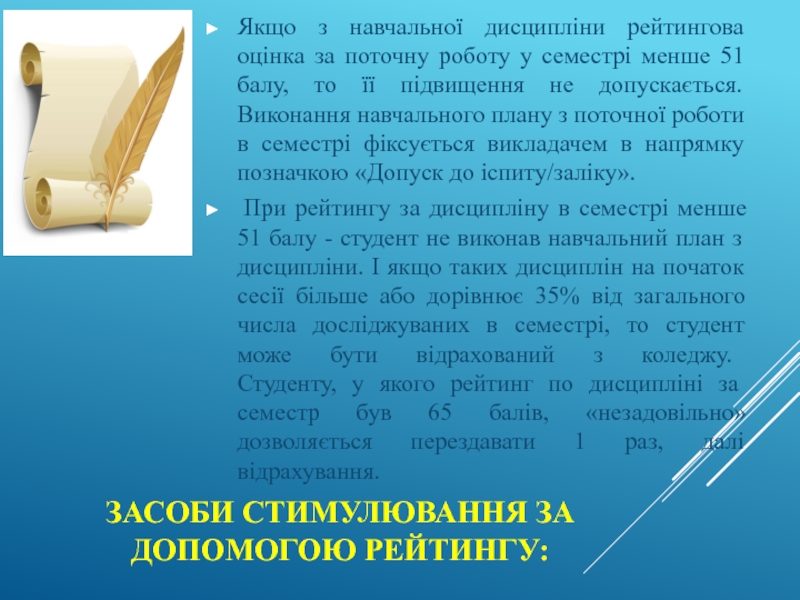 При рейтингу за дисципліну в семестрі менше 51 балу - студент не виконав навчальний план з дисципліни. І якщо таких дисциплін на початок сесії більше або дорівнює 35% від загального числа досліджуваних в семестрі, то студент може бути відрахований з коледжу.