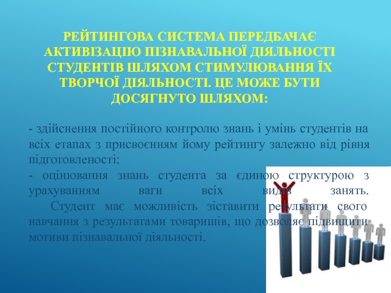 Слайд 5РЕЙТИНГОВА СИСТЕМА ПЕРЕДБАЧАЄ АКТИВІЗАЦІЮ ПІЗНАВАЛЬНОЇ ДІЯЛЬНОСТІ СТУДЕНТІВ ШЛЯХОМ СТИМУЛЮВАННЯ ЇХ ТВОРЧОЇ