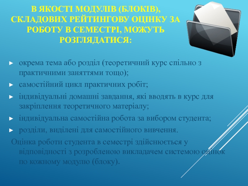 Слайд 8В ЯКОСТІ МОДУЛІВ (БЛОКІВ), СКЛАДОВИХ РЕЙТИНГОВУ ОЦІНКУ ЗА РОБОТУ В СЕМЕСТРІ,