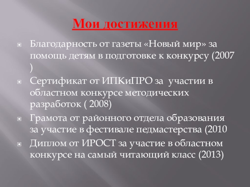 Мои достиженияБлагодарность от газеты «Новый мир» за помощь детям в подготовке к конкурсу (2007 )Сертификат от ИПКиПРО