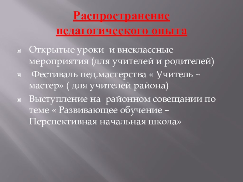 Распространение  педагогического опытаОткрытые уроки и внеклассные мероприятия (для учителей и родителей) Фестиваль пед.мастерства « Учитель –