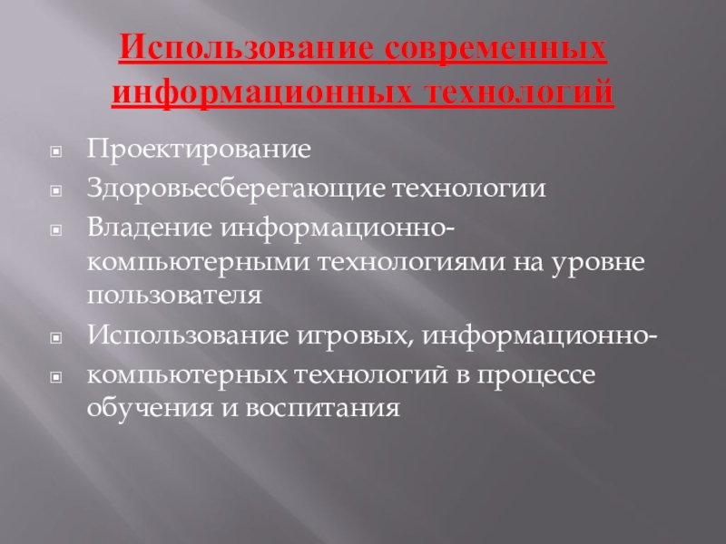 Использование современных информационных технологийПроектированиеЗдоровьесберегающие технологииВладение информационно- компьютерными технологиями на уровне пользователяИспользование игровых, информационно- компьютерных технологий в процессе