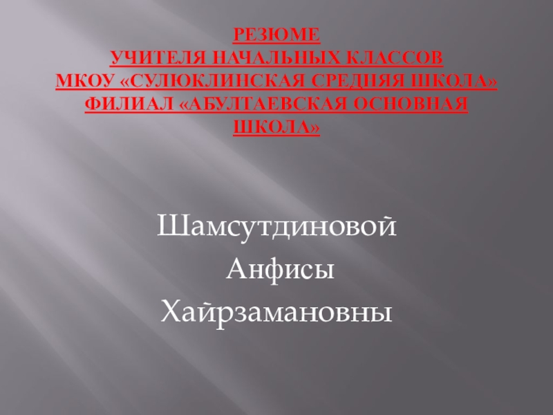 Слайд 1Резюме учителя начальных классов МКОУ «Сулюклинская средняя школа» филиал «Абултаевская основная школа»