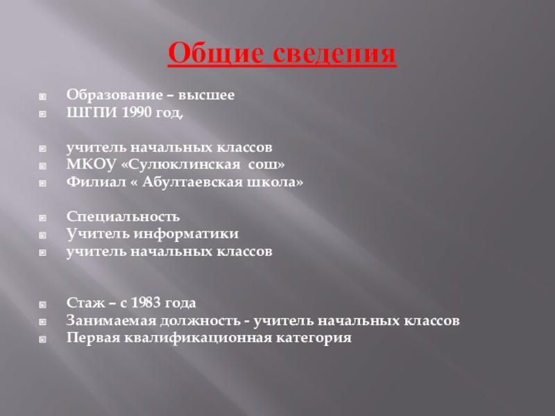 Общие сведенияОбразование – высшее ШГПИ 1990 год, учитель начальных классов МКОУ «Сулюклинская сош»Филиал « Абултаевская школа»