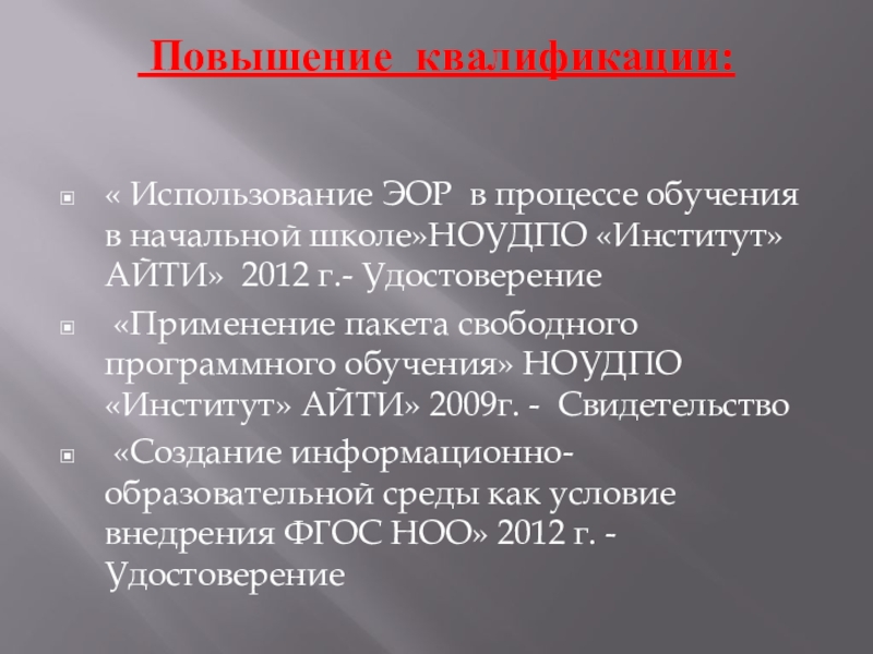 Повышение квалификации: « Использование ЭОР в процессе обучения в начальной школе»НОУДПО «Институт» АЙТИ» 2012 г.- Удостоверение «Применение