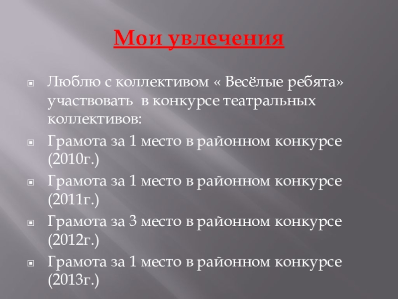 Мои увлеченияЛюблю с коллективом « Весёлые ребята» участвовать в конкурсе театральных коллективов:Грамота за 1 место в районном