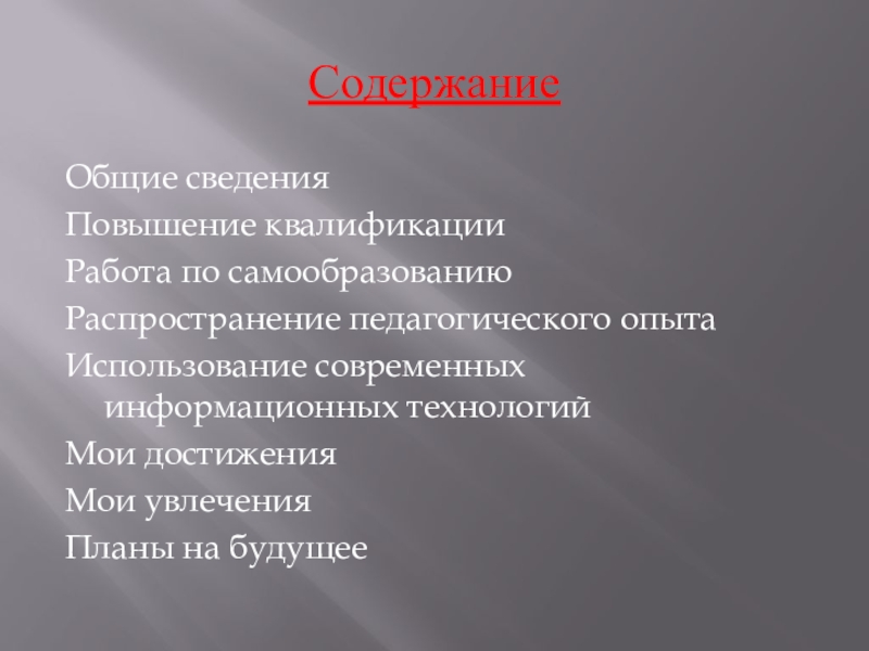 СодержаниеОбщие сведения Повышение квалификацииРабота по самообразованиюРаспространение педагогического опытаИспользование современных информационных технологийМои достижения Мои увлечения Планы на будущее