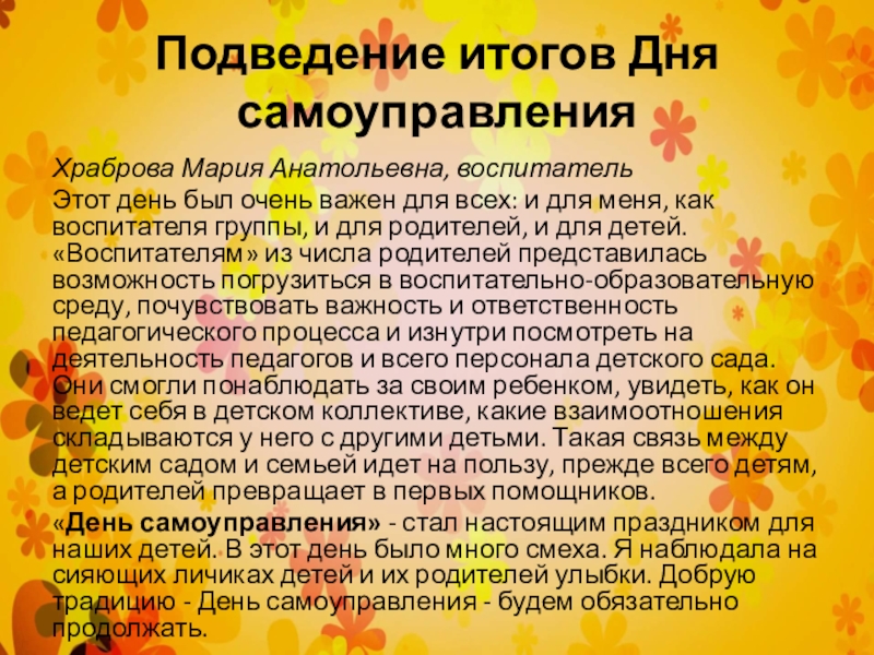 «День самоуправления» - стал настоящим праздником для наших детей. В этот день было много смеха. Я наблюдала на сияющих личиках детей и их родителей улыбки. Добрую традицию - День самоуправления - будем обязательно продолжать.
