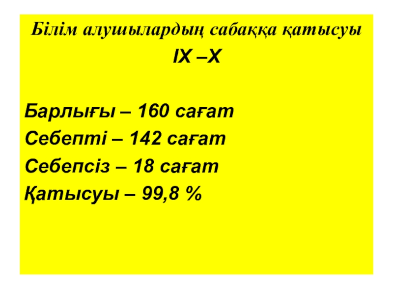 Білім алушылардың сабаққа қатысуы IХ –ХБарлығы – 160 сағатСебепті – 142 сағатСебепсіз – 18 сағатҚатысуы – 99,8