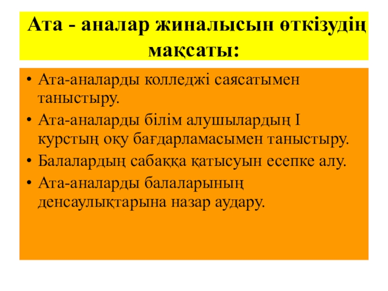 Ата - аналар жиналысын өткізудің мақсаты:Ата-аналарды колледжі саясатымен таныстыру.Ата-аналарды білім алушылардың І курстың оқу бағдарламасымен таныстыру.Балалардың сабаққа қатысуын есепке алу.Ата-аналарды балаларының денсаулықтарына назар аудару.