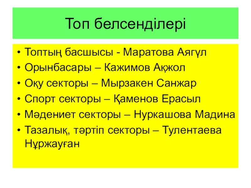 Топ белсенділеріТоптың басшысы - Маратова АягүлОрынбасары – Кажимов АқжолОқу секторы – Мырзакен СанжарСпорт секторы – Қаменов ЕрасылМәдениет