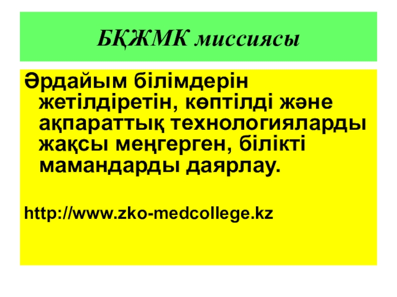 БҚЖМК миссиясыӘрдайым білімдерін жетілдіретін, көптілді және ақпараттық технологияларды жақсы меңгерген, білікті мамандарды даярлау.http://www.zko-medcollege.kz