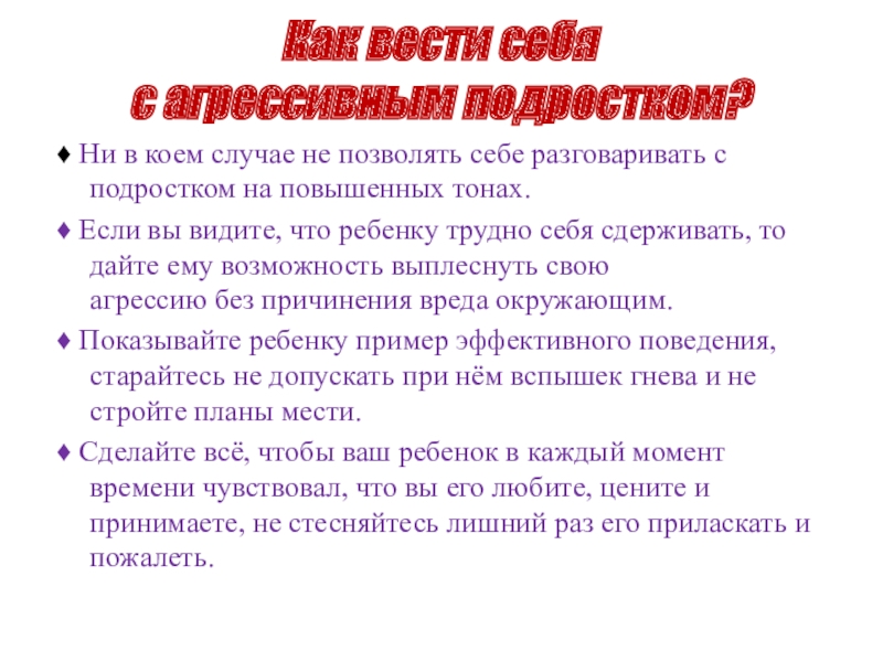 ♦ Показывайте ребенку пример эффективного поведения, старайтесь не допускать при нём вспышек гнева и не стройте планы мести.