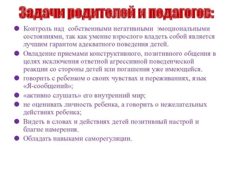 Овладение приемами конструктивного, позитивного общения в целях исключения ответной агрессивной поведенческой реакции со стороны детей или погашения уже имеющейся.