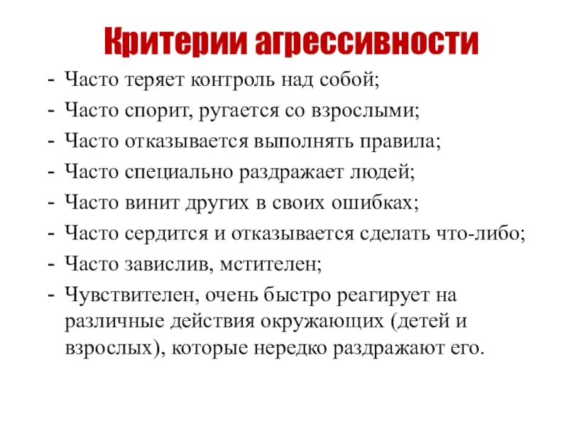 Агрессивные дети часто подозрительны и насторожены, любят перекладывать вину за затеянную ими ссору на других. Такие дети часто не могут сами оценить свою агрессивность, они не замечают, что вселяют в окружающих страх и беспокойство. Им, напротив, кажется, что весь мир хочет обидеть именно их. Таким образом, получается замкнутый круг: агрессивные дети боятся и ненавидят окружающих, а те, в свою очередь, боятся их.