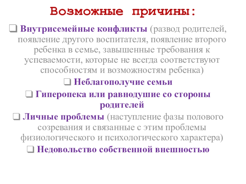 Внутрисемейные конфликты (развод родителей, появление другого воспитателя, появление второго