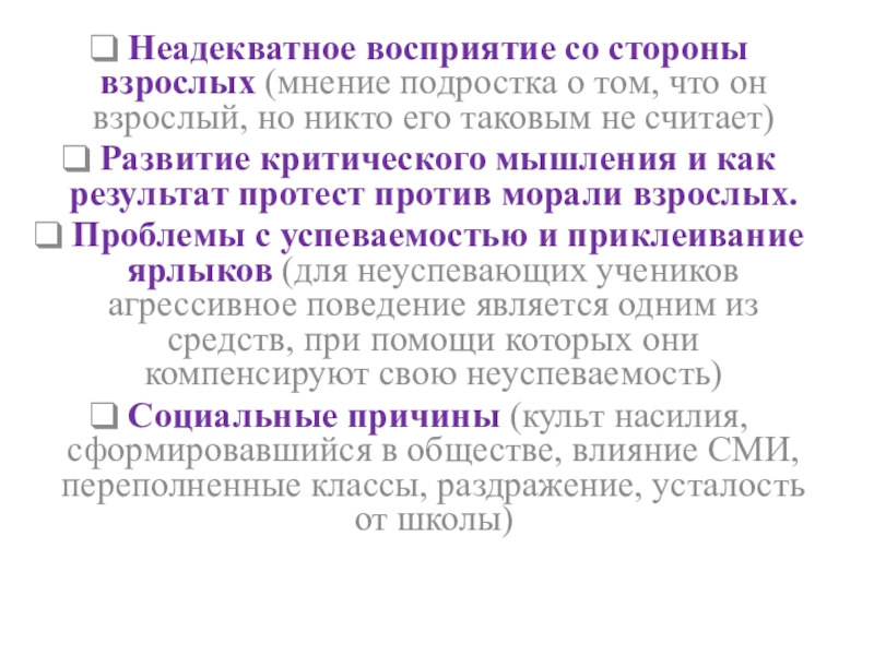 Слайд 5 Неадекватное восприятие со стороны взрослых (мнение подростка о том, что