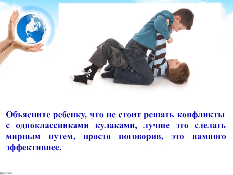 Слайд 5Объясните ребенку, что не стоит решать конфликты с одноклассниками кулаками, лучше