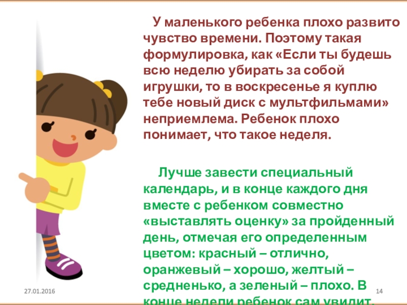 Поэтому такая формулировка, как «Если ты будешь всю неделю убирать за собой игрушки, то в воскресенье я куплю тебе новый диск с мультфильмами» неприемлема. Ребенок плохо понимает, что такое неделя.