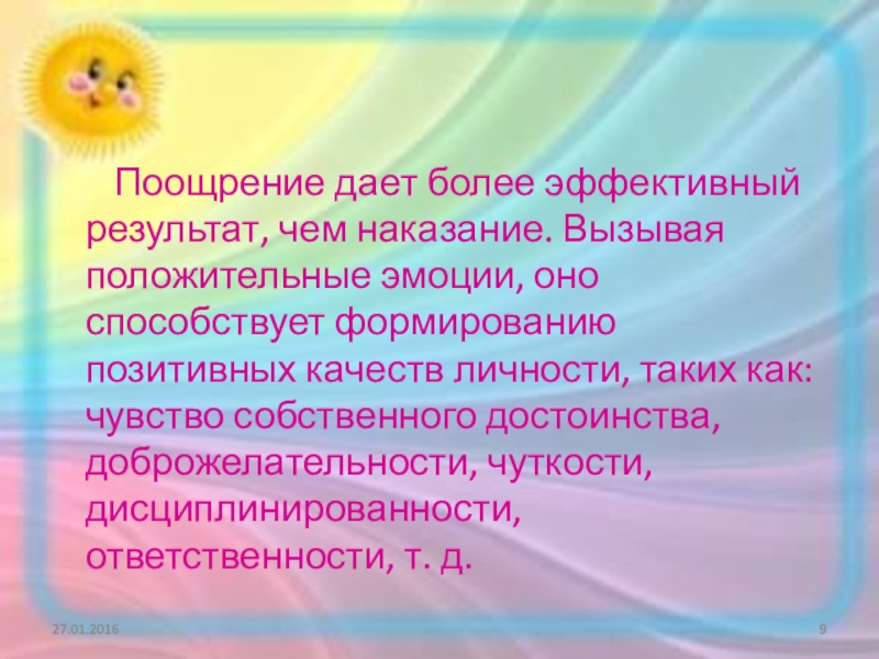 Слайд 9 Поощрение дает более эффективный результат, чем наказание.