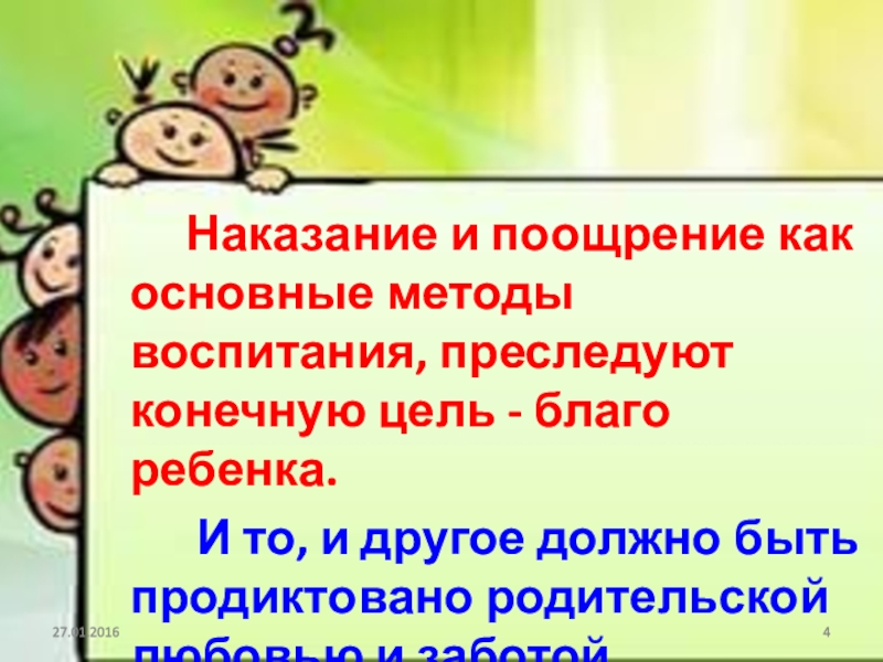 Слайд 4 Наказание и поощрение как основные методы воспитания,