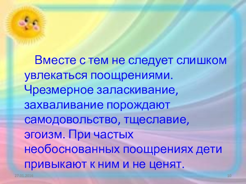 поощрениями. Чрезмерное заласкивание, захваливание порождают самодовольство, тщеславие, эгоизм. При частых необоснованных поощрениях дети привыкают к ним и не ценят.