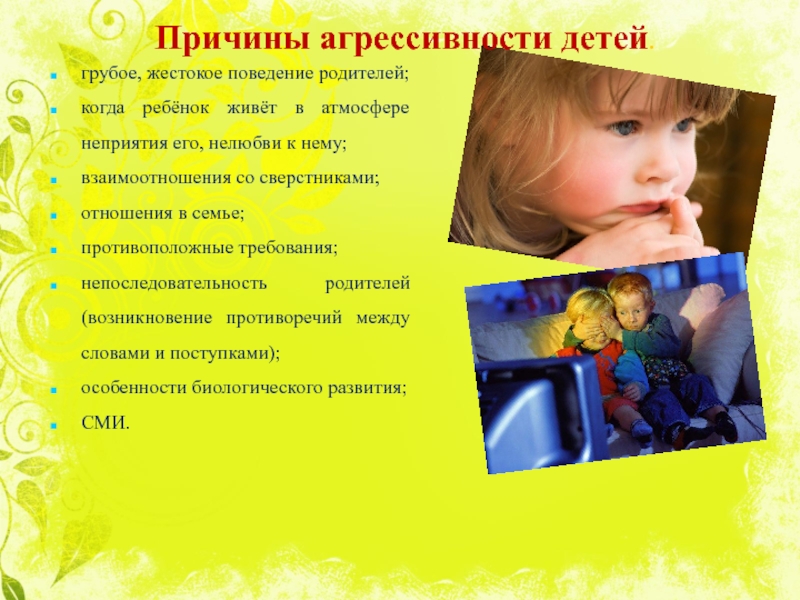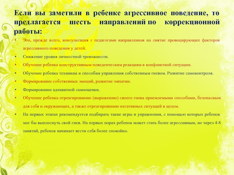 Это, прежде всего, консультация с педагогами направленная на снятие провоцирующих факторов агрессивного поведения у детей.