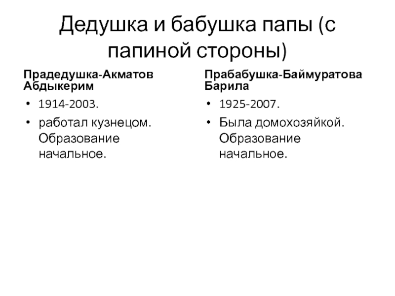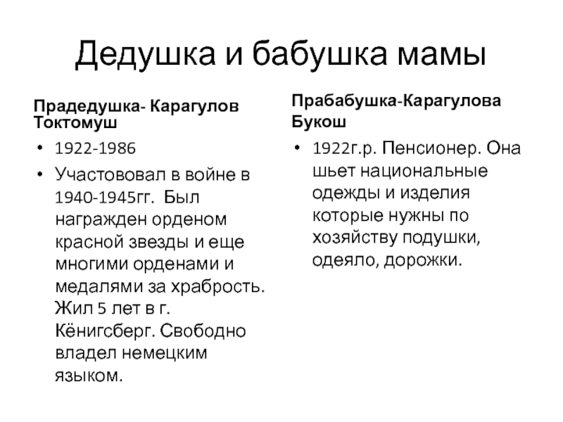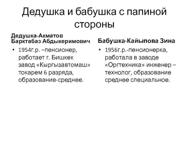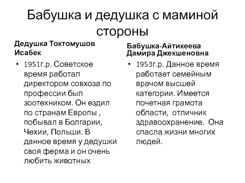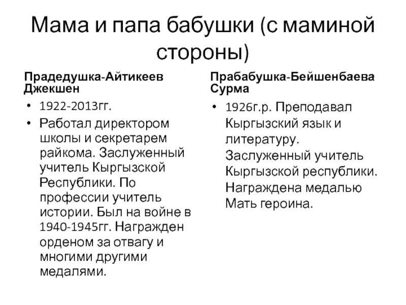 1926г.р. Преподавал Кыргызский язык и литературу. Заслуженный учитель Кыргызской республики. Награждена медалью Мать героина.