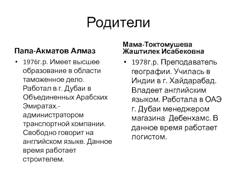 1978г.р. Преподаватель географии. Училась в Индии в г. Хайдарабад. Владеет английским языком. Работала в ОАЭ г. Дубаи менеджером магазина Дебенхамс. В данное время работает логистом.