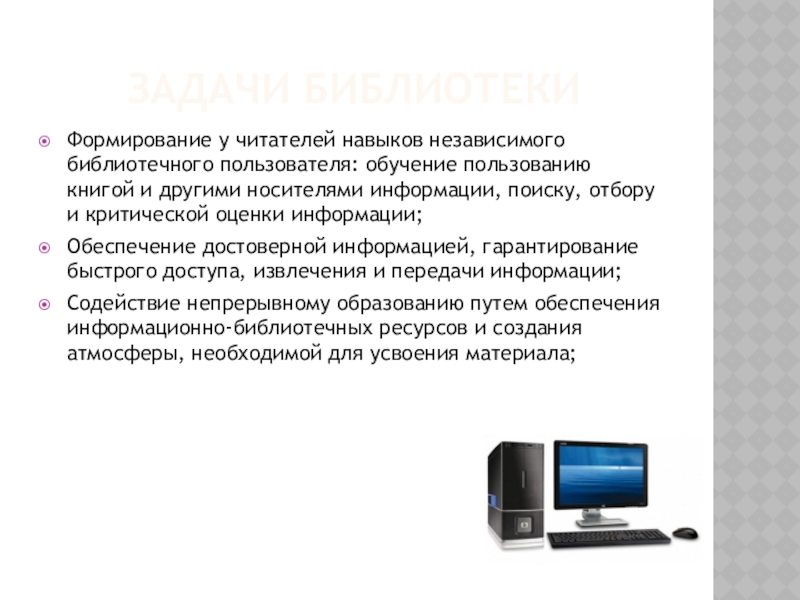 Содействие непрерывному образованию путем обеспечения информационно-библиотечных ресурсов и создания атмосферы, необходимой для усвоения материала;