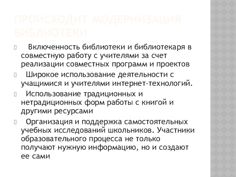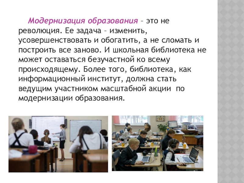 задача – изменить, усовершенствовать и обогатить, а не сломать и построить все заново. И школьная библиотека не может оставаться безучастной ко всему происходящему. Более того, библиотека, как информационный институт, должна стать ведущим участником масштабной акции по модернизации образования.