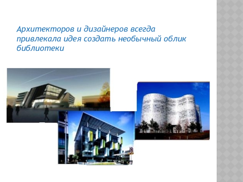Слайд 24Архитекторов и дизайнеров всегда привлекала идея создать необычный облик библиотеки