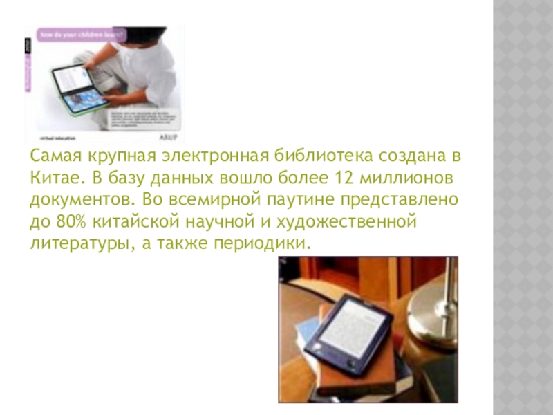 Слайд 20Самая крупная электронная библиотека создана в Китае. В базу данных вошло