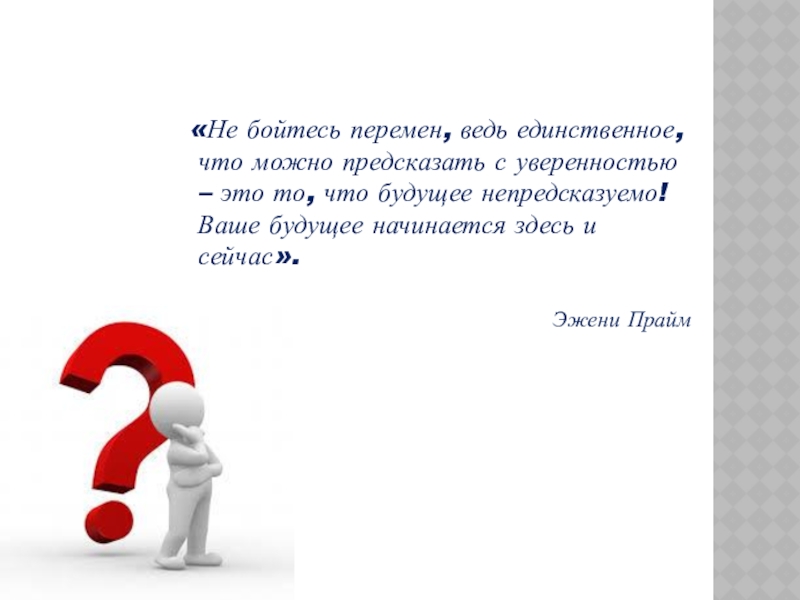 уверенностью – это то, что будущее непредсказуемо! Ваше будущее начинается здесь и сейчас».