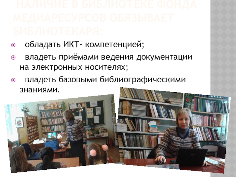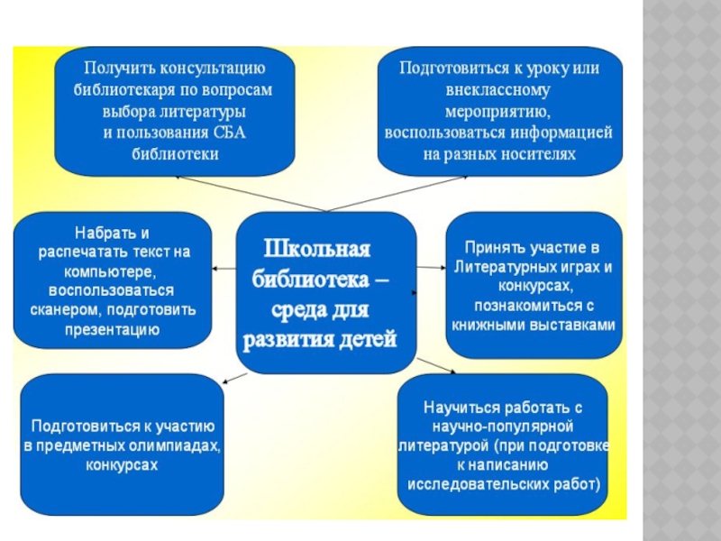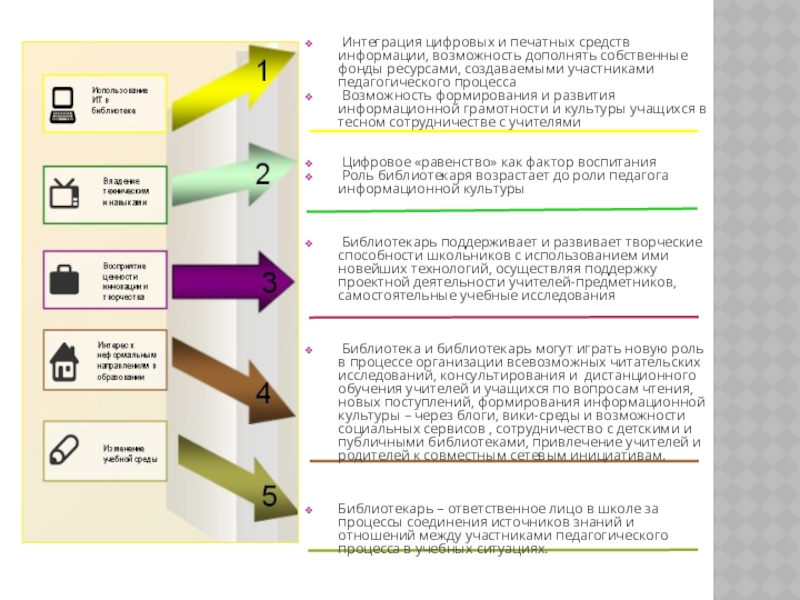 Библиотекарь – ответственное лицо в школе за процессы соединения источников знаний и отношений между участниками педагогического процесса в учебных ситуациях.