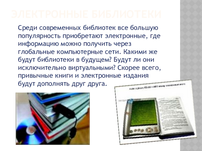 информацию можно получить через глобальные компьютерные сети. Какими же будут библиотеки в будущем? Будут ли они исключительно виртуальными? Скорее всего, привычные книги и электронные издания будут дополнять друг друга.