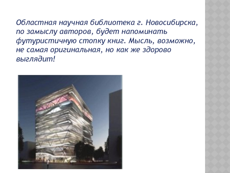 Слайд 25Областная научная библиотека г. Новосибирска, по замыслу авторов, будет напоминать футуристичную