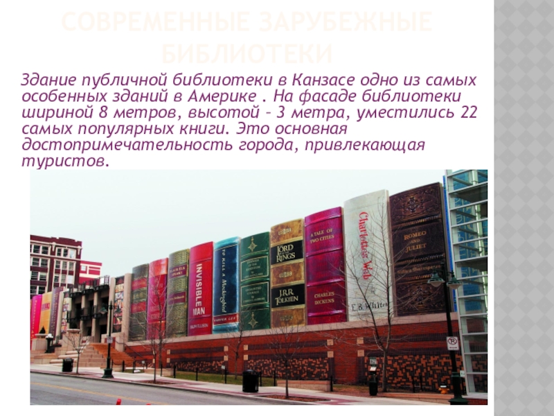 самых особенных зданий в Америке . На фасаде библиотеки шириной 8 метров, высотой – 3 метра, уместились 22 самых популярных книги. Это основная достопримечательность города, привлекающая туристов.