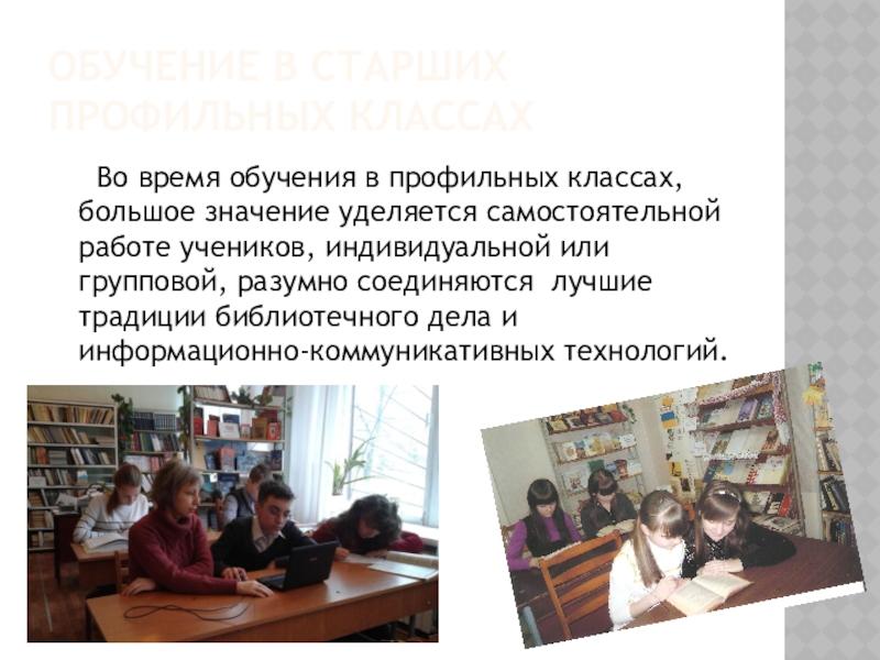 профильных классах, большое значение уделяется самостоятельной работе учеников, индивидуальной или групповой, разумно соединяются лучшие традиции библиотечного дела и информационно-коммуникативных технологий.