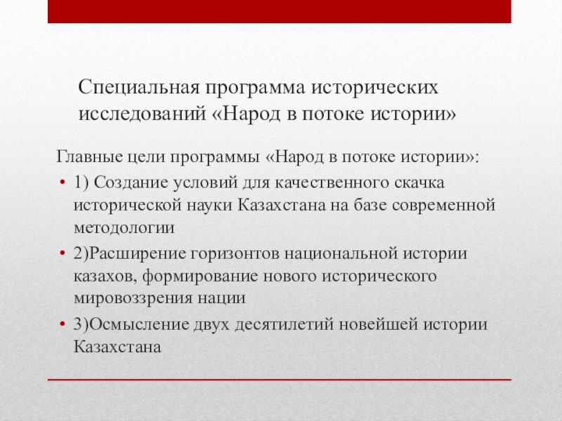 Специальная программа исторических исследований «Народ в потоке истории»Главные цели программы «Народ в потоке истории»:1) Создание условий для