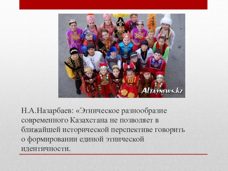Слайд 3Н.А.Назарбаев: «Этническое разнообразие современного Казахстана не позволяет в ближайшей исторической перспективе