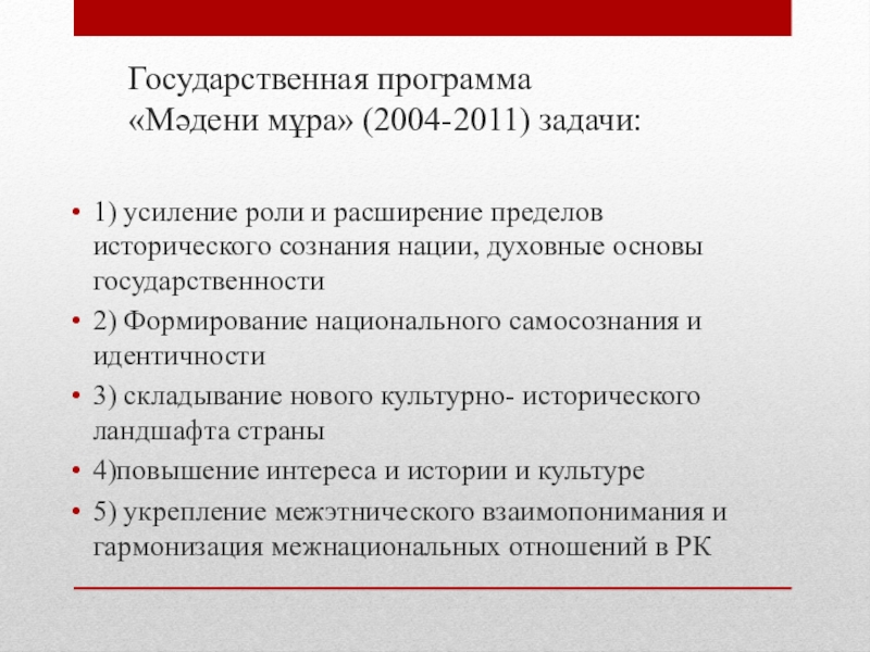 Государственная программа «Мәдени мұра» (2004-2011) задачи:1) усиление роли и расширение пределов исторического сознания нации, духовные основы государственности2)