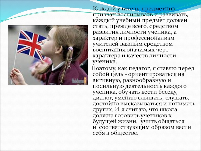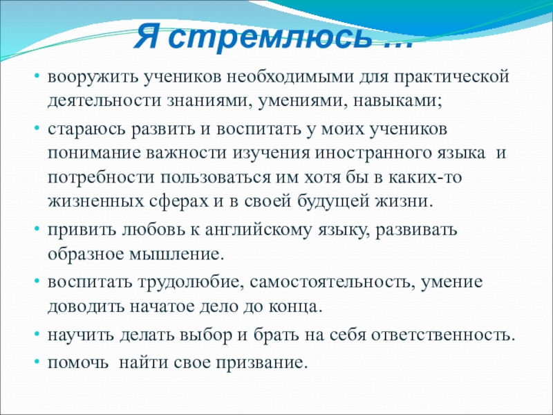 стараюсь развить и воспитать у моих учеников понимание важности изучения иностранного языка и потребности пользоваться им хотя бы в каких-то жизненных сферах и в своей будущей жизни.